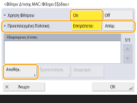 Ρυθμίστε την επιλογή <Χρήση Φίλτρου> σε <On>, επιλέξτε <Προεπιλεγμένη Πολιτική>, και έπειτα πατήστε <Αποθήκευση>.