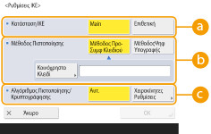 2 | Διαμορφώστε τις απαραίτητες ρυθμίσεις. ![]() <Εγκυρότητα>Ορίστε μια περίοδο ισχύος για τα IKE SA και IPSec SA που δημιουργούνται. Βεβαιωθείτε ότι έχετε ορίσει είτε <Ώρα> είτε <Μέγεθος>. Εάν ορίσετε και τα δύο, η περίοδος ισχύος λήγει όταν φτάσει στη μία από τις δύο τιμές. <PFS>Αν ορίσετε τη λειτουργία Perfect Forward Secrecy (PFS) σε <On>, αυξάνεται η μυστικότητα του κλειδιού κρυπτογράφησης, αλλά μειώνεται η ταχύτητα επικοινωνίας. Επιπλέον, η λειτουργία PFS θα πρέπει να είναι ενεργοποιημένη στη συσκευή αποδέκτη της επικοινωνίας. <Αλγόριθμος Πιστοποίησης/Κρυπτογράφησης>Επιλέξτε είτε <Αυτ.> είτε <Χειροκίνητες Ρυθμίσεις> για να ρυθμίσετε πώς θα ορίζεται ο αλγόριθμος πιστοποίησης και κρυπτογράφησης για τη φάση 2 του ΙΚΕ. Αν επιλέξετε <Αυτ.>, ορίζεται αυτόματα ο αλγόριθμος πιστοποίησης ESP και κρυπτογράφησης. Αν θέλετε να ορίσετε συγκεκριμένη μέθοδο πιστοποίησης, πατήστε <Χειροκίνητες Ρυθμίσεις> και επιλέξτε μία από τις παρακάτω μεθόδους πιστοποίησης.