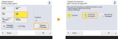 Αν επιλέξετε <PDF, OCR>, <XPS, OCR> ή <OOXML, OCR> ως τη μορφή αρχείου και η <Έξυπνη Σάρωση> ρυθμιστεί σε <On> στο <OCR (Text Searchable) Settings>, ανιχνεύεται ο προσανατολισμός του πρωτοτύπου και το έγγραφο περιστρέφεται αυτόματα, αν απαιτείται, πριν την αποστολή. <Ρυθμίσεις OCR (Αναζ. σε Κείμενο)> Αν επιλέξετε <PDF> ή <XPS> ως τη μορφή αρχείου, μπορείτε να ορίσετε τα <Συμπίεση> και <OCR (Αναζ. σε Κείμενο)> ταυτόχρονα. Σε αυτήν την περίπτωση, εμφανίζεται <PDF, Συμπίεση> ή <XPS, Συμπίεση> ως η μορφή αρχείου στην οθόνη βασικών λειτουργιών σάρωσης και αποστολής. Αν επιλέξετε <Word> για το <OOXML>, μπορείτε να ορίσετε τη διαγραφή των σαρωμένων εικόνων φόντου. Μπορείτε να δημιουργήσετε αρχεία Word στα οποία μπορεί να πραγματοποιηθεί εύκολα επεξεργασία χωρίς εικόνες. <Συμπερίλ. Εικόνων Φόντου σε Αρχείο Word> |