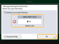 ![]() | Μπορείτε να σαρώσετε τα πρωτότυπα εκ των προτέρων και να αποστείλετε/αποθηκεύσετε τα σαρωμένα έγγραφα σε μια καθορισμένη ώρα. |