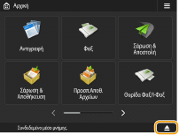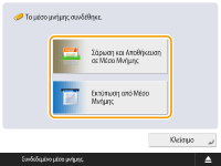 Αν το <Εμφάνιση Επιλογών Κατά τη Σύνδεση Μέσου Μνήμης> οριστεί σε <On>, εμφανίζονται συντομεύσεις για τις διαθέσιμες λειτουργίες όταν εισάγετε μέσα μνήμης. <Εμφάνιση Επιλογών Κατά τη Σύνδεση Μέσου Μνήμης> ![]() Καθώς οι συντομεύσεις ενδεχομένως να μην εμφανίζονται αν η συσκευή βρίσκεται σε κατάσταση αναστολής, εισαγάγετε το μέσο μνήμης αφού πρώτα επαναφέρετε τη συσκευή από την κατάσταση αναστολής. |