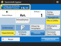 Εμφανίζει την κατάσταση ρυθμίσεων, όπως μέγεθος χαρτιού για την εκτύπωση και πλήθος εκτυπώσεων. Βεβαιωθείτε ότι έχετε επιβεβαιώσει τις ρυθμίσεις για να εκτελεστεί σωστά η εκτύπωση. Για να αλλάξετε τις ρυθμίσεις, πατήστε το κουμπί κάτω από το τμήμα της οθόνης. Για να αλλάξετε το πλήθος των εκτυπώσεων, πληκτρολογήστε τον αριθμό χρησιμοποιώντας τα αριθμητικά πλήκτρα.