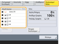 Το χαρτί μπορεί να μην έχει μπλοκαριστεί στην τοποθεσία που ελέγχετε. Ακόμη και σε αυτήν την περίπτωση, ακολουθήστε τις οδηγίες που εμφανίζονται στην οθόνη για να ελέγξετε όλες τις τοποθεσίες. Η οθόνη που υποδεικνύει ότι υπάρχει εμπλοκή χαρτιού, εμφανίζεται συνεχώς έως ότου αφαιρεθεί το μπλοκαρισμένο χαρτί. Εάν πατήσετε <Κλείσιμο> στην οθόνη που υποδεικνύει ότι υπάρχει εμπλοκή χαρτιού, μπορείτε να συνεχίσετε να εκτελείτε άλλες λειτουργίες και να καθορίζετε ρυθμίσεις χωρίς να προβείτε άμεσα στην αφαίρεση του μπλοκαρισμένου χαρτιού. Μην αφαιρέσετε χαρτί από τοποθεσία διαφορετική από εκείνη που εμφανίζεται στην οθόνη ως τοποθεσία εμπλοκής χαρτιού. Αυτό μπορεί να προκαλέσει εμπλοκές χαρτιού και σε άλλες τοποθεσίες ή απουσία σελίδων σε έξοδο εγγράφων. |