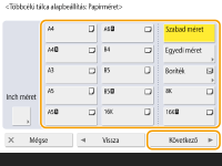 1 | Nyomja meg az <Egyedi méret> gombot. ![]() A papírméretnél megadhatja a <Szabad méret> lehetőséget, és ebben az esetben nem kell megadni a papírméret beállítását. A <Szabad méret> beállítást akkor válassza, ha ismeretlen méretű papírt adagol be másoláshoz, illetve ha a papírméret már regisztrálva van a nyomtató illesztőprogramjánál. |