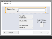 2 | Adja meg a szükséges beállításokat. ![]() <IKE mód>A kulcscsere-protokoll működési módját választhatja ki. A <Fő> lehetőség kiválasztása növeli a biztonságot, mivel maga az IKE-munkamenet van titkosítva, a munkamenet sebessége azonban kisebb, mint az <Agresszív> lehetőség esetében, mely esetben nincs titkosítva a teljes munkamenet. <Hitelesítési mód>Az alábbiakban bemutatott hitelesítési módok valamelyikét választhatja ki.