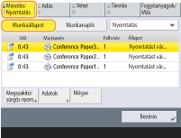 A kinyomtatott dokumentumok listájának megjelenítéséhez nyomja meg a <Munkanapló> gombot. Ha egy dokumentum nyomtatása hiba nélkül megtörténik, akkor az <Eredmény> oszlopban <OK> szerepel. Ha a <NJ> látható, az arra utal, hogy a nyomtatást leállították, vagy hiba történt.