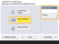 1 | Nyomja meg a <Könyvszéltörlés> gombot, majd ellenőrizze az <Eredeti mérete> beállítást. ![]() Ha az <Eredeti mérete> részben megjelenő méret eltér a könyv méretétől, akkor nyomja meg a <Változtat> gombot a méret módosításához. Csak az érintős vezérlőpanelen látható méretű eredetiket lehet beolvasni. |