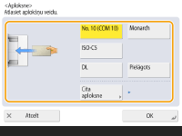 2 | Izvēlieties aplokšņu veidu. ![]() Lai reģistrētu pielāgota formāta aploksni, nospiediet <Pielāgots> <Tālāk> un <X> vai <Y>, lai norādītu otru malu, un pēc tam izmantojiet ciparu taustiņus, lai ievadītu norādītās malas garumu. |