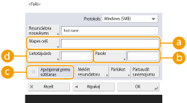1 | Ievadiet failu servera/Izvērstā telpa, kas sūta datus, resursdatora nosaukumu. ![]() Informāciju par failu serveri/Izvērstā telpa jautājiet tīkla administratoram. <Protokols>Izvēlieties failu servera protokolu no <Windows (SMB)>, <FTP> un <WebDAV>. Ja sūtāt dokumentu uz Izvērstā telpa, izvēlieties <Windows (SMB)> vai <WebDAV>. ![]() Ja izvēlaties <Windows (SMB)>, tiek parādītas pogas <Meklēt resursdatoru> un <Pārlūkot>. Failu serveri/Izvērstā telpa varat ērti norādīt, meklējot vai skatot tīklu. <Pārlūkot> iestatījumos varat reģistrēt līdz pieciem direktoriju serveriem. <Resursdatora nosaukums>Ievadiet failu servera/Izvērstā telpa resursdatora nosaukumu. Ja sūtāt dokumentu uz Izvērstā telpa, ievadiet <Resursdatora nosaukums>, kā norādīts tālāk. Ja kā protokolu izvēlaties <Windows (SMB)> Piemērs: Lai saglabātu koplietojamā vietā: \\192.168.100.50\share Lai saglabātu personīgā vietā: \\192.168.100.50\users Ja kā protokolu izvēlaties <WebDAV>, ievadiet <Resursdatora nosaukums>, kā norādīts tālāk, un nospiediet <Tālāk>. Ja TLS ir atspējots Piemērs: Lai saglabātu koplietojamā vietā: http://<IP adrese vai resursdatora nosaukums>/ Lai saglabātu personīgā vietā: http://<IP adrese vai resursdatora nosaukums>/ Ja TLS ir iespējots Piemērs: Lai saglabātu koplietojamā vietā: https://<IP adrese vai resursdatora nosaukums>/ Lai saglabātu personīgā vietā: https://<IP adrese vai resursdatora nosaukums>/ <Pārbaudīt savienojumu>Pēc resursdatora nosaukuma ievadīšanas nospiediet šo pogu, lai apstiprinātu savienojumu ar failu serveri/Izvērstā telpa. ![]() Ja izmantojat pieteikšanās pakalpojumu, piemēram, personu autentifikācijas pāvaldību, jāievada <Lietotājvārds> un <Parole>. |