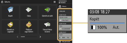 Varat pārbaudīt drukāšanas statusu, faksa ziņojumu sūtīšanas/saņemšanas statusu, lietošanas vēsturi utt. Šī funkcija arī ļauj pārbaudīt atlikušo papīra un tonera daudzumu, kļūdas statusu utt.