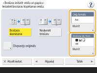 Nospiediet <Mainīt> iestatījumos <Oriģ. formāts> un izvēlieties oriģināla formātu. Ja izvēlaties <Autom.>, brošūras formāts tik automātiski izvēlēts atbilstoši oriģināla formātam.