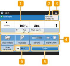 Tiek parādīts iestatījumu statuss, tostarp kopēšanas koeficients, papīra formāts un kopiju skaits. Pārbaudiet iestatījumus, lai kopēšana tiktu veikta pienācīgi. Lai mainītu iestatījumus, nospiediet pogu, kas atrodas zem parādīšanas sadaļas.