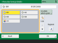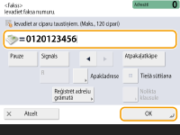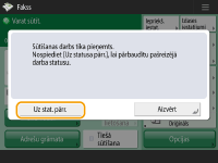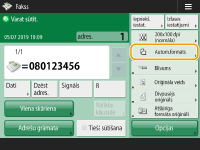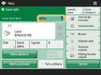 Kopējā norādīto adresātu skaita pārbaudīšanaNorādīto adresātu kopējais skaits ir attēlots ekrāna augšdaļā. Tādējādi varat pārliecināties, ka adresātu skaits ir pareizs, pirms sūtīšanas. ![]() Sūtīšana ar sūtītāja informācijuDokumentus var sūtīt, norādot sūtītāja vārdu un faksa numuru. <SŪT termināļa ID> Nosūtīto dokumentu statusu pārbaudeEkrānā <Stat.pārraudz.> var pārbaudīt nosūtīto dokumentu statusu. No šī ekrāna pēc statusa pārbaudes ir iespējams faksa dokumentu sūtīt atkāroti vai atcelt sūtīšanu. Nosūtīto un saņemto dokumentu statusa un žurnāla skatīšana Ja <Rādīt paziņojumu, kad darbs tiek akceptēts> ir iestatīts kā <On>, ekrāns Stat.pārraudz.> ir apskatāms no nākamā ekrāna, kas tiek parādīts pēc sūtīta dokumenta saņemšanas. <Rādīt paziņojumu, kad darbs tiek akceptēts> ![]() Ja notiek pārraides kļūda tādēļ, ka saņēmēja līnija ir aizņemta:iekārta pēc noteikta laika automātiski atkārto izsaukumu. Var norādīt, cik reižu iekārtai ir jāveic atkārtota izsaukšana, kā arī intervālus starp atkārtotas izsaukšanas reizēm. <Autom. atkārtot> Sūtīšanas rezultātu atskaites drukāšanaFaksa pamatfunkciju ekrānā nospiežot <Opcijas> <SŪT rezultātu atskaite>, var iestatīt automātisku sūtīšanas rezultātu atskaites drukāšanu.Lai to iestatītu katram sūtījumam no sadaļas <Opcijas>, ir jāaizvēlas <Tikai kļūdas gadījumā> vai <Izsl.> sadaļā <SŪT rezultātu atskaite>, tad jāiestata iespēja <Atļaut druk. no ekrāna Opcijas> kā <Iesl.>. Ja ir iestatītas vairākas tālruņa līnijasVar izvēlēties tālruņa līniju, kas jāizmanto faksu sūtīšanai, nospiežot <Opcijas> <Atlasīt līniju>. Pamācību faksa līnijas iestatījumu norādīšanai skatiet sadaļā Faksa līnijas iestatījumi. |