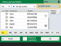 <Reģistr.jaunu adresātu>, <Dati/rediģ.>, un <Dzēst> sadaļā <Reģistrēt/rediģēt> ekrānā <Adrešu grāmata (lokālā)> var izmantot, lai reģistrētu jaunu adresātu, pārbaudītu detalizēto informāciju un labotu/dzēstu adresātus. Lai izmantotu attālo adrešu grāmatu, ir jākonfigurē serveriekārtas iestatījumi. Serveriekārtā iestatiet attālās adrešu grāmatas ārēju atvēršanu. |