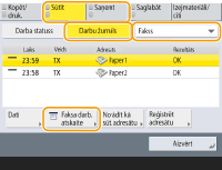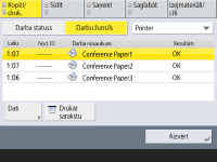 Ja drukātā saraksta kolonnā “RESULT” (Rezultāti) tiek parādīti burti “NG”, pārbaudiet trīsciparu skaitli aiz rakstzīmes “#”, lai atrastu iemeslu un risinājumus. Ja opcija <Pārvaldības iestatījumi> <Ierīces pārvaldība> <Ierobežot piekļuvi citu lietotāju darbiem> ir iestatīta uz <Iesl.>, uzdevumi, kas nav pieteiktā lietotāja uzdevumi, tiek parādīti kā “***”, un tos nevar apstrādāt. Ja piesakāties, izmantojot administratora tiesības, tiek parādīti visu lietotāju uzdevumi. |