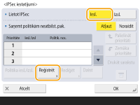 IPSec politiku pārvaldīšanaJūs varat rediģēt politikas ekrānā, kas redzams 3. darbībā. Lai rediģētu informāciju politikā, izvēlieties politiku sarakstā un nospiediet <Rediģēt>. Lai atspējotu politiku, izvēlieties politiku sarakstā un nospiediet <Politika iesl./izsl.>. Lai dzēstu politiku, izvēlieties politiku sarakstā un nospiediet <Dzēst> <Jā>. |
