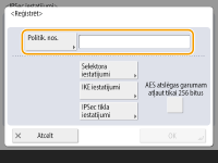 Neatkarīgi no <Formatēt šifrēšanas metodi uz FIPS 140-2> iestatījuma IPSec sakariem, tiks izmantots šifrēšanas modulis, kuram jau ir saņemts FIPS140-2 sertifikāts. Lai IPSec sakari atbilstu FIPS 140-2 prasībām, tīkla vidē, kurai iekārta pieder, IPSec sakaros gan DH, gan RSA atslēgas garums ir jāiestata uz 2048 bitiem vai vairāk. Tikai DH atslēgas garumu var norādīt, izmantojot iekārtu. Konfigurējot apkārtējo vidi, ņemiet to vērā, jo iekārtā nav RSA iestatījumu. Jūs varat reģistrēt līdz pat 10 drošības politikām. |
