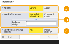 2 | Konfigurējiet nepieciešamos iestatījumus. ![]() <IKE režīms>Izvēlieties darbības režīmu atslēgu apmaiņas protokolam. Drošība tiek uzlabota, ja izvēlaties <Galvenā>, jo IKE sesija pati par sevi ir šifrēta, taču sesijas ātrums ir mazāks nekā, izmantojot <Agresīvi>, kas nešifrē visu sesiju. <Autentifikācijas metode>Atzīmējiet vienu no turpmāk aprakstītajām autentifikācijas metodēm.