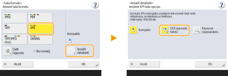 ![]() | Šis režīms ļauj izpildīt OCR (rakstzīmju optisko pazīšanu), lai no skenētā attēla izgūtu datus, ko var atpazīt kā tekstu, un izveidotu PDF/XPS/OOXML (pptx/docx) failu, kurā var veikt meklēšanu. Tāpat varat iestatīt arī <Kompakts>, ja esat atlasījis faila formātu PDF vai XPS. Informāciju par papildaprīkojumu, kas nepieciešams šīs funkcijas lietošanai, un failu formātiem skatiet sadaļā Sistēmas iespējas. |