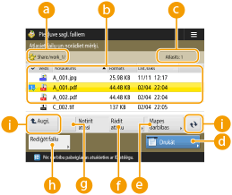 Saglabātie faili un mapesParāda, vai faili un mapes ir atlasīti, ikonas ar faila tipu vai mapi, nosaukumus, failu izmērus un saglabāšanas datumus/laikus.