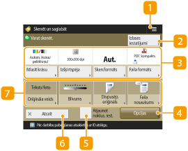 Parāda iestatījumu statusu, piemēram, izšķirtspēju un skenēšanas formātu. Pārliecinieties, vai iestatījumi ir apstiprināti, lai skenētu pareizi. Lai mainītu iestatījumus, nospiediet pogu zem ekrāna daļas. Informāciju par iestatījumiem skatiet sadaļā