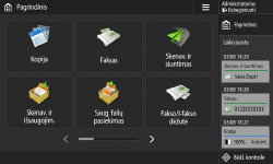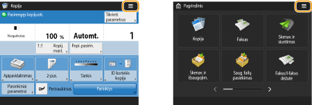Ekrane <Pagrindinis> paspaudus funkcijų mygtukus, atsidaro pagrindinių funkcijų ekranas, kuriame galite iškviesti tokias funkcijas, kaip kopijavimas, faksogramų siuntimas ir nuskaitymas. Nors pagrindinių funkcijų ekranas ir jo parametrai gali skirtis priklausomai nuo funkcijų, parametrus galite keisti pagal savo poreikius.
