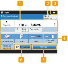 Rodoma parametro būsena, pavyzdžiui, kopijų mastelis, popieriaus dydis ir kopijų skaičius. Norėdami tinkamai nukopijuoti, būtinai patvirtinkite parametrus. Norėdami pakeisti parametrus, paspauskite mygtuką, esantį žemiau ekrano. Pagrindiniai kopijavimo veiksmai