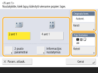 Norėdami pasidaryti dvipuses kopijas arba nuskaityti dvipusius originalus, kad padarytumėte vienpuses kopijas, paspauskite <2-pusio parametrai>. Daugiau informacijos apie nustatymą rasite