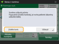 Bendro nurodytų adresatų skaičiaus tikrinimasViršutiniame dešiniajame ekrano kampe rodomas bendras nurodytų adresatų skaičius. Tai leidžia prieš siunčiant įsitikinti, kad adresatų skaičius teisingas. Kaip nedelsiant atšaukti siuntimo užduotįKol užduotis siunčiama, valdymo skyde paspaudus  rodomas pranešimas <Ar atšaukti nurodytą siuntimo užduotį?>. Norėdami atšaukti siuntimą paspauskite <Taip>. Paspauskite  esant kelioms siuntimo užduotims, kad būtų rodomas atšaukiamos siuntimo užduoties pasirinkimo ekranas. Jei siuntimo užduotis, kurią norite atšaukti, nerodoma, paspauskite <Patikrinti kitas užduot.>, kad būtų rodoma <Siuntimo užduotys>. Pasirinkite užduotį, kurią norite atšaukti, ir paspauskite <Atšaukti>. Išsiųstų / įrašytų dokumentų būsenos tikrinimasKai <Pranešimo rodymas priėmus užduotį> nustatyta kaip <Įjungt.>, <Būkl. kontrolė> ekranas gali būti rodomas kitame ekrane, kuris rodomas gavus siuntimo užduotį. <Pranešimo rodymas priėmus užduotį>Siunt. rezultato ataskaita Siunt. rezultato ataskaita Kaip atspausdinti siuntimo / įrašymo rezultatų ataskaitąPagrindinių nuskaitymo funkcijų ekrane paspaudę <Parinktys>  <Siunt. rezultato ataskaita> galite nustatyti, kad būtų automatiškai atspausdinama ataskaita, kurioje pateikti siuntimo / įrašymo rezultatai. Norėdami tai nustatyti kiekvienai užduočiai iš <Parinktys>, reikia pasirinkti <Tik įvykus klaidai> ar <Išjungt.> dalyje <Siunt. rezultato ataskaita>, o tada nustatyti <Leisti spausdinti iš Nuostatos> kaip <Įjungt.>. Failo vardasKai failas siunčiamas / įrašomas, jo pavadinimas automatiškai nustatomas pagal šį formatą. Galite pakeisti parametrą, kad būtų galima priskirti kitą pavadinimą. Failo pavadinimo nustatymasSiunčiant el. paštu formatu „Užduoties numeriai (keturi skaitmenys)_puslapių numeriai (trys skaitmenys).failo plėtinys“, pvz., „1042_001.jpg“. Serveryje failas įrašomas formatu „Metai, mėnuo, diena, valanda, minutė ir sekundė (14 skaitmenų).failo plėtinys“, pvz., „20151030133541.jpg“. Elektroninio laiško tema |