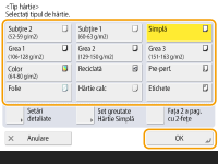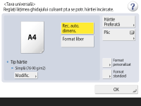 <OK>. Înregistrarea formatului şi a tipului de hârtie utilizat frecvent cu tava universală