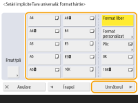 Apăsaţi <X> sau <Y> pentru a introduce lungimea fiecărei părţi utilizând tastele numerice. ![]() Dacă înregistraţi formatul de hârtie pe care îl utilizaţi frecvent pe butoanele <S1> – <S4>, puteţi să le apelaţi cu o singură atingere. Înregistrarea unui format liber de hârtie (format personalizat) | |
