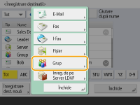 1 | Selectaţi destinaţiile pe care doriţi să le înregistraţi într-un grup şi apăsaţi <OK>. ![]() Listă derulantă Tip documentSelectaţi (e-mail), (fax), (I-fax) sau (fişier) pentru a filtra destinaţiile afişate în lista de adrese ( ). Apăsaţi <Tot> pentru a afişa toate destinaţiile înregistrate. <Detalii>Selectaţi o destinaţie şi apăsaţi <Detalii> dacă doriţi să verificaţi setările destinaţiei. Apăsaţi <OK> pentru a reveni la ecranul anterior. Listă de destinaţiiSe afişează destinaţiile înregistrate în lista de adrese pe care aţi selectat-o la pasul 6. Din această listă, selectaţi destinaţiile pe care doriţi să le înregistraţi într-un grup. ![]() Atunci când destinaţiile sunt gestionate prin numere de acces, acestea nu se afişează în listă decât dacă introduceţi numărul de acces (Restricţionarea accesului la destinaţiile înregistrate în Agendă) după ce aţi apăsat <Nr. de acces>. Butonul primei litereSelectaţi butonul alfanumeric pentru primul caracter al numelui destinaţiei. Apăsaţi <Tot> pentru a afişa toate destinaţiile înregistrate. <Căutare după nume>Introduceţi numele destinaţiei. Apăsaţi din nou <Căutare după nume> pentru a reveni la ecranul anterior. |