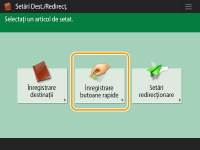 ![]() | Este comod să înregistraţi o destinaţie utilizată frecvent într-un buton rapid. Acest lucru vă permite să specificaţi rapid o destinaţie cu o simplă apăsare de buton. În afară de înregistrarea unui număr de fax sau a unei adrese de e-mail într-un buton rapid, puteţi înregistra şi locaţia unui folder de pe un server de fişiere (adresa IP şi calea) care va fi utilizat pentru stocarea datelor scanate. |