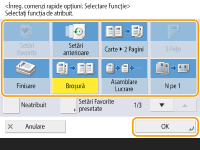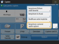 Numărul de articole de setare amplasate în ecranul Caracteristici de bază şi locul afişării depind de fiecare funcţie. Butonul de comenzi rapide nu se va afişa dacă <Neatribuit> s-a setat ca o comandă rapidă. Limita numărului de comenzi rapide pentru <Opţiuni> pe care le puteţi înregistra este după cum urmează. Copiere: 5 Fax: 4 Scanare şi Transmitere: 2 |