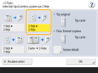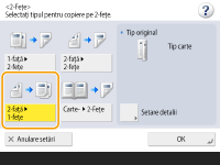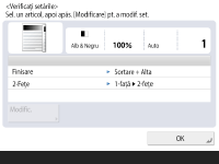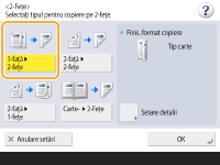 ![]() | Puteţi să copiaţi documente cu o faţă pe ambele feţe ale hârtiei. De asemenea, puteţi copia un document faţă-verso pe ambele feţe ale hârtiei sau pe două coli separate. Copierea de pe 1-faţă pe 2-feţe Copierea de pe 2-faţă pe 2-feţe Copierea de pe 2-faţă pe 1-feţe |