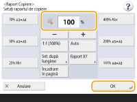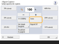 La copierea cu raport de copiere egal pe hârtie care are aceeaşi dimensiune cu documentul original, este posibil să lipsească puţin din marginile documentului copiat. Pentru a evita acest lucru, micşoraţi documentul apăsând <Rprt Cop.> <Încadrare în pagină> pentru a obţine marginile lipsă ale documentului.Dacă selectaţi <Încadrare în pagină>, opţiunea <Deplasare> este setată automat la <Centru>. Nu puteţi scana originale foarte transparente, cum ar fi foliile transparente, utilizând setarea Auto pentru raportul de copiere. Folosiţi în schimb modul Zoom presetat sau Zoom în procente. Dacă setaţi <Auto>, trebuie să selectaţi manual o dimensiune a hârtiei. Dacă nu selectaţi un format de hârtie, raportul de copiere este setat automat în funcţie de hârtia încărcată în sertarul 1. |