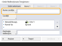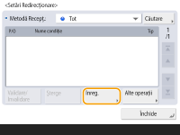 De asemenea, puteţi afişa ecranul <Setări redirecţionare> apăsând <Setări Dest./Redirecţ.>(Ecranul <Acasă>) <Setări redirecţionare>. |