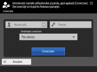 | | Cu această metodă, utilizatorii se conectează introducând numele de utilizator şi parola folosind tastatura afişată pe panoul de control. Această metodă este disponibilă indiferent de dispozitivul de autentificare utilizat. |