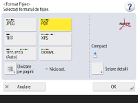Opţiunea <PDF; Ident. & Ajust> este valabilă numai cu următoarele setări: Selectare culoare: Mod color diferit de modul alb-negru Rezoluţie: 300 dpi x 300 dpi Opţiunea <PDF; Compact> sau <XPS; Compact> este valabilă numai cu următoarele setări: Selectare culoare: Mod color diferit de modul alb-negru Rezoluţie: 300 dpi x 300 dpi Documentele <Word> pentru care s-a setat <OOXML> pot fi trimise numai cu următoarele setări. Selectare culoare: Mod color diferit de modul alb-negru Rezoluţie: 300 dpi x 300 dpi Documentele <PowerPoint> pentru care s-a setat <OOXML> pot fi trimise numai cu următoarele setări. Selectare culoare: Mod color diferit de modul alb-negru Rezoluţie: 300 dpi x 300 dpi sau 600 dpi x 600 dpi Dacă selectaţi <PDF; Ident. & Ajust>, aparatul ar putea să nu identifice corect care părţi ale documentului scanat sunt text şi desene cu linii, în funcţie de documentul scanat. Textul şi fundalul fişierelor PDF care conţin date scalabile pot deveni nealiniate iar textul şi desenele cu linii ar putea să nu se afişeze în funcţie de versiunea de Adobe Illustrator utilizată pentru a deschide PDF. Când creaţi fişiere pe paginiPentru a scana un original cu mai multe pagini şi a salva fiecare pagină ca fişier separat, în loc să salvaţi toate paginile ca un singur fişier, apăsaţi <Divizare pe pagini>. Pentru a specifica numărul de pagini care trebuie incluse în fiecare fişier, după ce apăsaţi <Divizare pe pagini>, specificaţi numărul de pagini dorit. Pentru a salva fiecare pagină ca fişier separat, specificaţi <1> pentru numărul de pagini. Dacă selectaţi <TIFF/JPEG>, fiecare pagină va fi creată automat ca fişier separat, în conformitate cu modul Selectare culoare. Când alb-negru este setat pentru modul Selectare culoare: TIFF Când o setare diferită de alb-negru este setată pentru modul Selectare culoare: JPEG Nu puteţi specifica numărul de pagini care trebuie incluse într-un singur fişier dacă utilizaţi momentan funcţia <Scanare şi Stocare>. |
