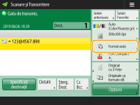 Pentru a verifica numărul total de destinaţii specificateNumărul total de destinaţii specificate este afişat în partea din dreapta-sus a ecranului. În acest fel puteţi să verificaţi dacă numărul de destinaţii este corect, înainte de trimitere. ![]() Pentru a anula imediat o lucrare care este în curs de trimitereDacă apăsaţi pe panoul de control în timp ce o lucrare este transmisă, apare mesajul <Se pot anula următoarele lucrări de trimitere?>. Apăsaţi <Da> pentru a anula trimiterea.Puteţi să selectaţi <Ultima lucrare recepţionată> sau <Se trimite Lucrarea> pentru a alege lucrarea de anulat. <Lucrare Anulată când apăsaţit Stop> Apăsaţi când există mai multe lucrări de trimitere, pentru a afişa ecranul de selectare a lucrării de trimitere de anulat. Dacă lucrarea de trimitere pe care doriţi să o anulaţi nu este afişată, apăsaţi <Verificaţi alte Lucrări> pentru a afişa <Lucrări trimitere>. Selectaţi lucrarea pe care doriţi să o anulaţi, apoi apăsaţi <Anulare>.Pentru a verifica stările pentru documentele trimise/salvatePe ecranul <Monitor Statut>, puteţi să verificaţi stările pentru documentele trimise/salvate. Acest ecran vă permite să trimiteţi/salvaţi documente din nou sau să anulaţi trimiterea/salvarea după ce verificaţi stările. Verificarea stării şi a jurnalului pentru documentele scanate Când opţiunea <Afişare Notificare când lucrarea este acceptată> este setată la <Pornit>, ecranul <Monitor Statut> poate fi afişat din ecranul următor care se afişează după ce este primită o lucrare trimisă. <Afişare Notificare când lucrarea este acceptată> ![]() Pentru a imprima raportul pentru rezultatele trimiterii/salvăriiÎn ecranul Caracteristici de bază pentru scanare, apăsând <Opţiuni> <Raport rezultat TX> puteţi efectua setări pentru a imprima automat raportul cu listarea rezultatelor trimiterii/salvării.Pentru a stabili acest lucru pentru fiecare lucrare din <Opţiuni>, este necesar să selectaţi <Doar pentru erori> sau <Oprit> în <Raport rezultat TX>, apoi să setaţi <Perm. tipărirea din Opţiuni> la <Pornit>. Nume fişierCând un fişier este trimis/salvat, numele fişierului este setat automat pe baza formatului următor. Puteţi modifica setarea astfel încât să poată fi atribuit un nume diferit. Setarea unui fişier Când trimiteţi prin e-mail „Numere de lucrări (patru cifre)_numere de pagină (trei cifre).numele extensiei fişierului”, cum ar fi „1042_001.jpg” Când se salvează într-un server de fişiere „Anul, luna, ziua, ora, minutul şi secunda, fişierul este salvat (14 cifre).numele extensiei fişierului”, cum ar fi „20151030133541.jpg” Subiectul e-mailuluiSubiectul introdus în <Subiect predefinit> este setat automat (<Subiect predefinit>). Dacă specificaţi un subiect diferit, modificaţi setarea sau specificaţi de fiecare dată când trimiteţi un e-mail (Specificarea setărilor de e-mail). |