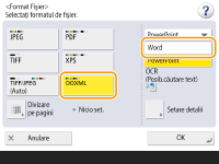 1 | Selectaţi <OOXML> selectaţi <Word> din lista verticală.![]() ![]() Pentru a schimba o limbă de utilizat pentru OCR, apăsaţi <Setare detalii> <Modificare> selectaţi o limbă sau un grup de limbi apăsaţi <OK>.Selectaţi o limbă sau un grup de limbi în funcţie de limba utilizată în documentele scanate. |