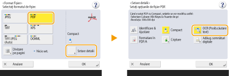 1 | Selectaţi <PDF> , apăsaţi <Setare detalii> <OCR (Căutare Text)>.![]() |