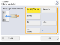 2 | Vyberte typ obálok. ![]() Ak chcete uložiť obálku vlastného formátu, stlačte tlačidlo <Užívateľ.> <Ďalší> a stlačením tlačidla <X> alebo <Y> špecifikujte stranu, potom pomocou číselných tlačidiel zadajte dĺžku špecifikovanej strany.Stlačte tlačidlo <OK> a prejdite na krok č. 5. |