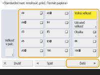 2 | Vyberte typ obálok. ![]() Ak chcete uložiť obálku vlastného formátu, stlačte tlačidlo <Užívateľ.> <Ďalší> a stlačením tlačidla <X> alebo <Y> špecifikujte stranu, potom pomocou číselných tlačidiel zadajte dĺžku špecifikovanej strany. |