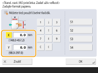 Stlačte tlačidlo <X> alebo <Y> a zadajte dĺžku každej strany pomocou číselných tlačidiel. ![]() Ak uložíte často používanú veľkosť papiera na tlačidlá <S1> až <S4>, môžete ju vyvolať jedným dotykom. Uloženie papiera ľubovoľného formátu (papier vlastného formátu) | |