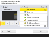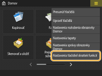 Tlačidlovú skratku pre funkcie môžete vytvoriť na obrazovke <Domov>. Toto tlačidlo môžete použiť na prístup k rôznym funkciám bez návratu na obrazovku <Domov>. Ak chcete vytvoriť skratku, prihláste sa s oprávneniami správcu.
