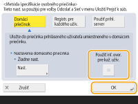 3 | Vyberte, aké overovacie údaje chcete používať, a stlačte <OK>. Ak chcete k osobnému priečinku používať samostatné používateľské meno a heslo, stlačte položku <Použiť inf. over. pre kaž. užív.> a začiarknite ju. Ak chcete používať rovnaké používateľské meno a heslo ako pri prihlasovaní, zrušte začiarknutie. Ak je táto položka začiarknutá, pre každého používateľa je nutné zaregistrovať používateľské meno a heslo. ![]() V domovskom priečinku sa vytvoria priečinky s nasledujúcimi názvami: Ak je začiarknutá položka <Použiť inf. over. pre kaž. užív.>: používateľské meno určené používateľom Ak položka <Použiť inf. over. pre kaž. užív.> nie je začiarknutá: používateľské meno používané na prihlasovanie |