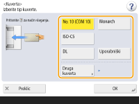 1 | Pritisnite <Kuverta>. Ovojnice kot vrste papirja ni mogoče izbrati na zaslonu s podrobnostmi možnosti <Tip papirja>. Če želite kot vrsto papirja izbrati ovojnico, vrsto papirja registrirajte v <Registr. priljubljenega papirja (Večnam. podstavek)>, nato v 2. koraku pritisnite <Priljubljeni papir> gumb, za katerega ste registrirali ovojnico kot vrsto papirja <OK>. Registracija pogosto uporabljene velikosti in vrste papirja za večnamenski pladenj |