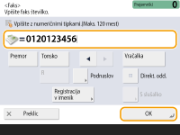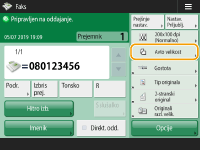 Preverjanje skupnega števila navedenih prejemnikovSkupno število izbranih prejemnikov je prikazano na vrhu zaslona. Tako lahko pred pošiljanjem preverite, ali je število prejemnikov pravilno. ![]() Pošiljanje z informacijami o pošiljateljuDokument lahko pošljete z imenom in številko faksa pošiljatelja. <ID pošiljatelja> Preverjanje stanja poslanih dokumentovStanje poslanih dokumentov lahko preverite na zaslonu <Nadzor stanja>. Na tem zaslonu lahko po preverjanju stanj fakse pošljete znova ali prekličete njihovo pošiljanje. Preverjanje stanja in dnevnika oddanih in sprejetih dokumentov Ko je možnost <Prikaz obvestila, ko je opravilo sprejeto> nastavljena na <On>, je mogoče zaslon <Nadzor stanja> prikazati s tega zaslona, ki se prikaže, ko je poslano opravilo prejeto. <Prikaz obvestila, ko je opravilo sprejeto> ![]() Napaka oddajanja, ker je prejemnikova linija zasedenaNaprava po določenem obdobju samodejno znova pokliče številko. Te nastavitve, na primer število ponovnih klicanj naprave in interval med ponovnimi klicanji, lahko spremenite. <Avto pon. izb.> Tiskanje poročila z rezultati pošiljanjaČe na zaslonu z osnovnimi funkcijami faksa pritisnete <Opcije> <Poročilo o rezultatu ODD>, lahko nastavite, da naprava samodejno natisne poročilo o rezultatih pošiljanja.Če želite v razdelku <Opcije> to nastaviti za vsa opravila, morate v razdelku <Poročilo o rezultatu ODD> izbrati <Samo ob napaki> ali <Ne> in nato nastaviti <Omogoči izpisovanje z opcij> na <Da>. Ko je nastavljenih več telefonskih linijTelefonsko linijo za pošiljanje faksov lahko izberete tako, da pritisnete <Opcije> <Izbira linije>. Za navodila o izbiri nastavitev za linijo faksiranja glejte razdelek Nastavitve linije za faks. |