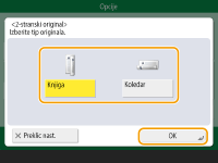1 | Pritisnite <Bris. okvirja knjige> in potrdite <Velik. originala>. ![]() Če se velikost, prikazana v <Velik. originala>, razlikuje od velikosti knjige, pritisnite <Sprem.>, da izberete velikost. Način brisanja okvira knjige lahko nastavite samo za velikosti izvirnika, ki so prikazane na zaslonu na dotik. |